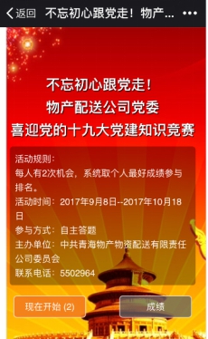 (物產(chǎn)配送公司 訊 龐玲/文)為了迎接黨的十九大勝利召開(kāi),物產(chǎn)配送公司黨委在9月8日-10月18日期間開(kāi)展"喜迎黨的十九大"微信公眾平臺(tái)黨建知識(shí)答題活動(dòng)。