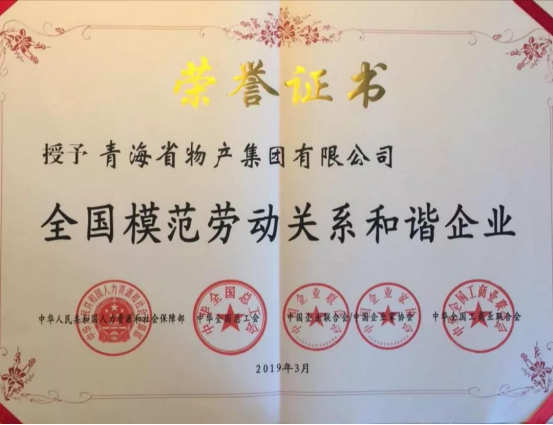 由青海省人力資源和社會(huì)保障廳、青海省總工會(huì)、青海省企業(yè)聯(lián)合會(huì)/企業(yè)家協(xié)會(huì)、青海省工商業(yè)聯(lián)合會(huì)共同推薦申報(bào),青海省物產(chǎn)集團(tuán)有限公司、青?;ブ囡乒煞萦邢薰尽⒄铰窐蚪ㄔO(shè)股份有限公司榮獲全國(guó)模范勞動(dòng)關(guān)系和諧企業(yè)光榮稱號(hào),西寧經(jīng)濟(jì)技術(shù)開發(fā)區(qū)東川工業(yè)園區(qū)榮獲全國(guó)模范勞動(dòng)關(guān)系和諧工業(yè)園區(qū)光榮稱號(hào),受到了國(guó)家人力資源和社會(huì)保障部、中華全國(guó)總工會(huì)、中國(guó)企聯(lián)、全國(guó)工商聯(lián)的隆重表彰。