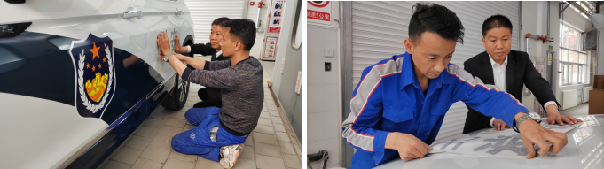 5為:售后漆工冶龍正在為警車貼警徽標志,他說:“警車是公務用車,每次粘警飾我都感到很神圣,干活兒特別用心細致,一定要把車身警飾做得非常好才行。警徽閃耀,守望千家萬戶。我是漆工也是工匠,必須精益求精,把活兒干漂亮,這也是汽貿(mào)漆工的臉面。每次我都把車清洗干凈,用卷尺量好間距,用記號筆畫好。在貼的過程中用刮板反復擠壓空氣,這樣才能使警徽粘得更牢固更美觀。我要把公司倡導的勞動精神、工匠精神,通過不斷地學習鍛煉,提高本領(lǐng),把精湛的工匠手藝和貼心的服務傳遞給社會。
