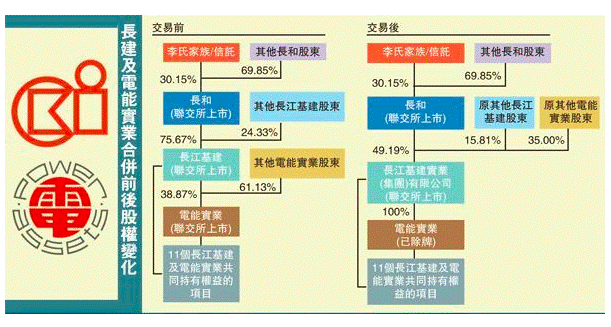 (下圖為長建及電能合并前后的股權變化,圖片來自香港《文匯報》)